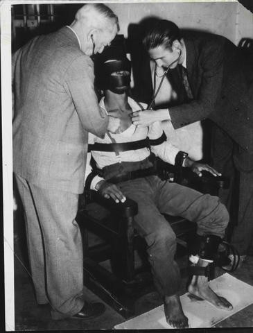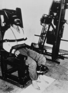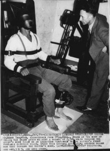 Ready to be executed, this man’s head has been totally immobilized by leather straps. One electrode is wrapped around his bare right foot.