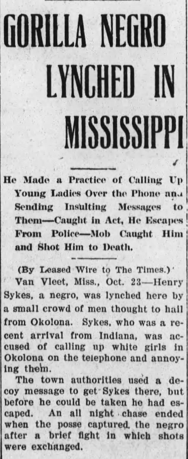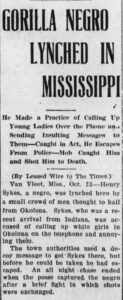 “Gorilla Negro Lynched in Mississippi” headline for Henry Sykes murder in Rawleigh Times, North Carolina, October 23, 1907